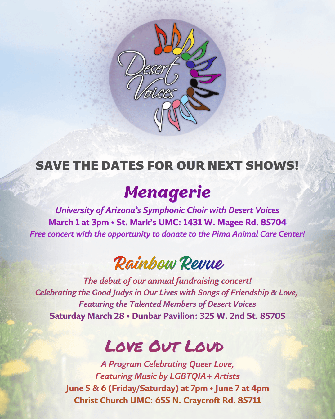 Since 1988, Desert Voices has served as a pillar of Tucson’s diverse LGBTQIA+ and Ally community, and we are proud to continue our mission today: